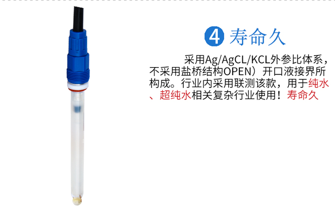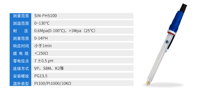 聯(lián)測SIN-pH5100電極使用耐壓半球形pH敏感膜,混合膠GMT構(gòu)成的中介電介質(zhì),Ag/AgCL/KCL外參比體系,無鹽橋(OPEN)開口液接界所構(gòu)成。